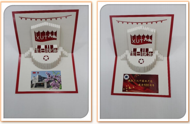 相关媒体报道链接: 西安发布——百年党史红色文创作品亮相西安理工大:https://xafbapp.xiancn.com/template/amucsite//pad/index.html#/detail/6269783?site1&columnID=193 荟萃网——西安理工大:百人百件复合纸艺作品献礼建党百年:https://www.baokanhuicui.com/2021-06/28/content_9113453.html 原点新闻 —— 百年党史红色文创作品亮相 西安理工大 :http://yuandian.xiancity.cn/application/fcinformation/mobile/?t=ArticleDetail112427#/ArticleDetail/112427/undefined 红色印记 纸短情长——看印包百人百日百件作品致敬党的百年风华!https://mp.weixin.qq.com/s/aW-Q5HR2QzLPR0hka_3utQ 宝藏|“纸短情长——绘色绘影讲百年党史”主题文创作品展引起校内外广泛关注https://mp.weixin.qq.com/s/kl6__Y2BbC1DB63lghjxQg 六、学子深受教育 寄语感怀心声的历史重任 在制作过程中,小组成员经常对党的历史与国家的发展进行探讨,加深了大家对党史的了解,也进一步增强了学习党史的兴趣。 ——研究生党员 冯世林 在整个创作过程中,真切感受到了团队中每一个人对于党的一份真挚情怀,第一次将自己所学专业同党史知识联系起来,既是动手的过程,也是学习的过程,非常生动有趣。 ——本科生党员 马辉辉 在制作过程中,我们经历了很多次失败,最终在团队协作下,找到了突破口,完成了作品创作。这次活动使我们能够运用科学的方法来处理问题,不仅提高了我们的动手能力,锻炼了耐心、谨慎的工作态度,也培养了团队合作精神,更增强了学习自信心! ——本科生 刘京华 我很荣幸,很激动,在中国共产党百年华诞之际,能通过自己亲手制作的两件作品为党庆祝生日。我的作品采用红、黄配色。“红”,是无数革命先烈用鲜血染成的颜色,是我们革命精神的源泉与动力,象征着热血。“黄”,指中国共产党带领人民取得的伟大胜利,是辉煌的,闪着金光;细节处采用粉色,浅蓝色,绿色等点缀,以体现我党历经百年,风华正茂。 ——本科生 李龙泉 通过全程参与此次活动,进一步增强了专业荣耀感、使命感,我们要传承红色经典,牢记使命,奋发有为,争做时代新人。 ——本科生 姜涛